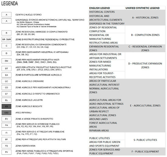 An example from a municipal regulatory plan from 2011—from the original legend (in Italian language) to the unified legend for PTM (Ref. Ministerial Decree 1444/68).