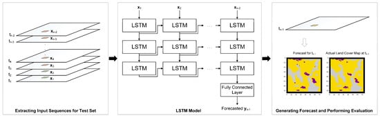 The systematic assessment of RNN, specifically LSTM, involves modeling scenarios established to represent a typical development progression. The model response to changing geospatial input is assessed in each scenario. This involves changing the temporal resolution parameter to the next smallest increment possible while maintaining the comparison of the same LC data layer across all scenarios. For each change of temporal resolution, the experiments are performed on one of the different datasets containing a different number of classes. The aim is to observe if there are trends in model response on changed temporal resolution despite model optimizations. An overview of the end-to-end methodology used to generate forecasted maps in each scenario is shown in Figure 1.
