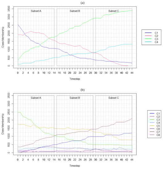 Number of cells belonging to each class at each timestep in the (a) 4 class, (b) 8 class, and (c) 16 class real-world LC datasets. Class membership” shows how many cells belong to each class at each timestep.