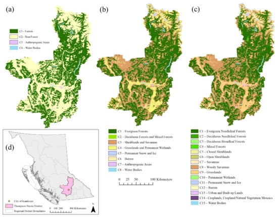 Real-world study area for 2001 considering (a) 4 classes, (b) 8 classes, and (c) 15 classes, focused on the Thompson-Nicola Regional District in British Columbia, Canada (d).