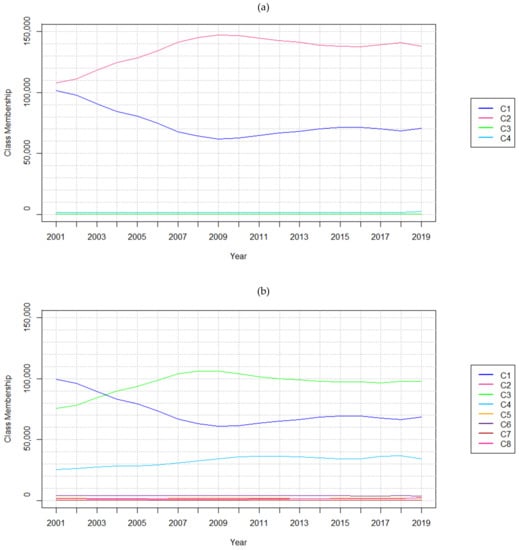 After clipping the MODIS LC data to the regional district boundary, three datasets were developed to feature 4, 8, and 15 LC classes, respectively (Table 4). This involved reclassifying the original data featuring 15 classes aggregated to 8 classes first, then to 4 classes (Figure 4). Within this real-world LC dataset, rates of change increase and decrease according to not only anthropogenic and environmental disturbances but are also affected by classification errors. These changes are reflected in the increases and decreases of cells belonging to each class for each of the 19 years considered for these experiments (Table 5, Figure 4).
