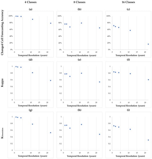 Trends in performance metrics versus increasing temporal resolution in results obtained with the 45-year hypothetical LC datasets with 4, 8, and 16 classes. The changed cell forecasting accuracy (a–c), Kappa (d–f), and KSimulation (g–i) measures have been depicted for each number of LC classes.
