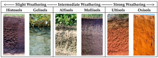 Taxonomic pedodiversity in the contiguous U.S. exhibits a wide range of soil diversity, with 11 soil orders, 65 suborders, 317 great groups, 2026 subgroups, and 19,602 series (Table 7). Table 7 shows the “soil order abundance”—total area of each soil order within the contiguous U.S. based on Soil Survey Geographic (SSURGO) Database (2020) with the following distribution: (1) Mollisols (27%), (2) Alfisols (17%), (3) Entisols (14%), (4) Inceptisols and Aridisols (11% each), (5) Spodosols (3%), (6) Vertisols (2%), and (7) Histosols and Andisols (1% each). In terms of the degree of weathering: slightly-weathered soils are 27%, intermediately-weathered soils are 58%, and strongly-weathered soils are 15% of the total area.
