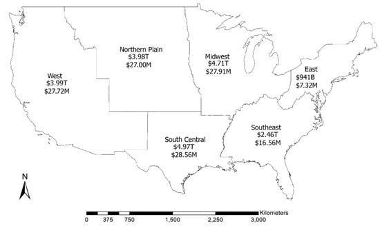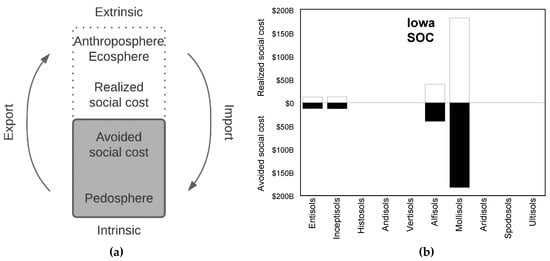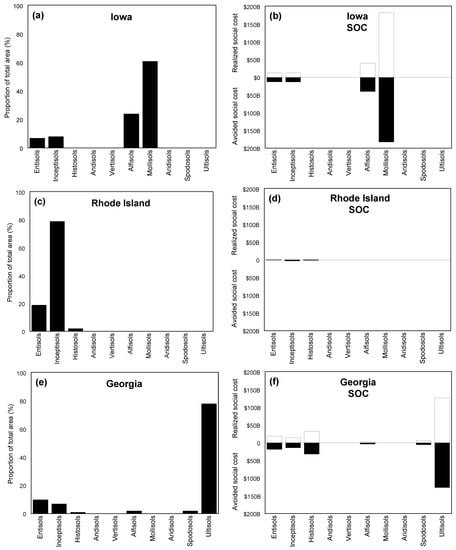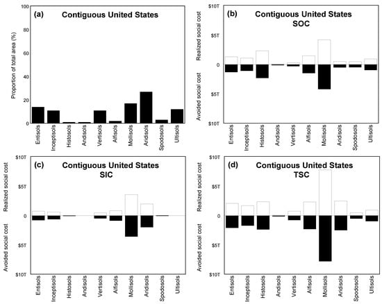 Soil organic carbon is particularly important for agricultural production, and Mikhailova et al. (2019) [] estimated the value of SOC stocks in the contiguous United States based on the avoided social costs of carbon emissions and reported that the total calculated monetary value for SOC storage in the contiguous U.S. was between $4.64T and $23.1T, with a midpoint value of $12.7T []. Soil orders with the highest midpoint SOC storage values were (1): Mollisols ($4.21T), (2) Histosols ($2.31T), and (3) Alfisols ($1.48T) []. The midpoint values of SOC normalized by area within soil order boundaries were ranked: (1) Histosols ($21.58 m−2), (2) Vertisols ($2.26 m−2), and (3) Mollisols ($2.08 m−2) []. States with the highest midpoint values of SOC storage were: (1) Texas ($1.08T), (2) Minnesota ($834B), and (3) Florida ($742B) []. Midpoint values of SOC normalized by area within state boundaries were ranked: (1) Florida ($5.44 m−2), (2) Delaware ($4.10 m−2), and (3) Minnesota ($3.99 m−2) []. Regions with the highest midpoint values of SOC storage were: (1) Midwest ($3.17T), (2) Southeast ($2.44T), and (3) Northern Plains ($2.35T) []. Midpoint values of SOC normalized by area within region boundaries were ranked: (1) Midwest ($2.73 m−2), (2) Southeast ($2.31 m−2), and (3) East ($1.82 m−2) [].