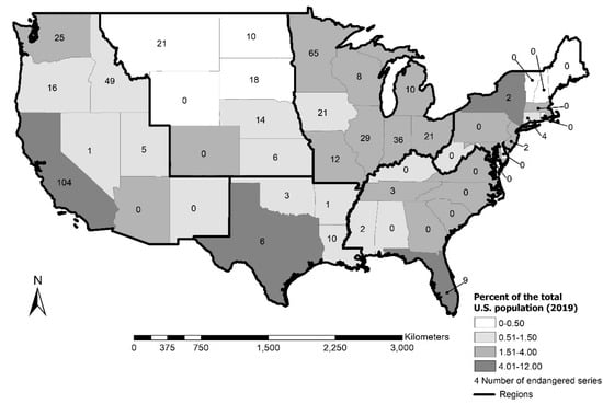 Number of endangered soil series [] and percent of the total U.S. population (2019) [] in the contiguous United States (U.S.).