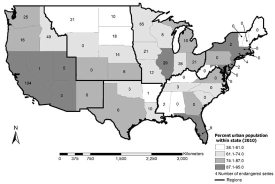 Number of endangered soil series [] and percent of the urban population within each state (2010) [] in the contiguous United States (U.S.).