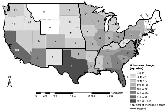 Mapping can provide spatial context between population, urbanization, and endangered soil series (Table 13, Figure 5 and Figure 6). Results show that there is a link between states and regions with a high number of endangered soil series and the value of provisioning and regulating ES (California; Midwest, Northern Plains, and South-Central regions). States and regions with zero endangered series represent areas with generally low productivity soils such as Aridisols (e.g., Arizona and New Mexico), Ultisols (e.g., Georgia, South Carolina, and North Carolina), and Entisols and Inceptisols (e.g., Maine and Vermont) (Table 13, Figure 5).