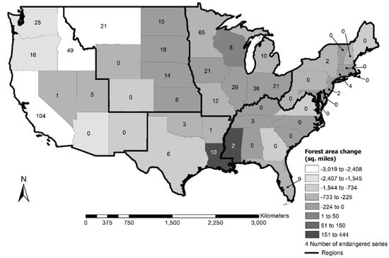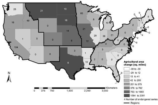Some states and regions have low human populations, but some of the highest proportions of endangered rare soil series (Table 13, Figure 5). For example, the Northern Plains region has only 4.19% of the total U.S. population and some of the highest numbers of endangered soil series [,]. In the Midwest, Iowa has almost 81% of its rare soil series endangered, but it has only 0.95% of the total U.S. population (Table 13, Figure 5) [,]. Similarly, Kansas has nearly 43% of its rare soil series endangered, but it has only 0.88% of the U.S. population. These states have some of the highest values associated with provisioning ES from SOC, SIC, and TSC, as well as regulating ES/ED associated with these carbon stocks. A mismatch between “potential” and “realized” supply/demand of flow-dependent ES/ED [] is not a new phenomenon for Kansas, which experienced soil degradation and the Dust Bowl in the past due to a combination of prolonged drought and “suitcase farming,” which was sponsored by “non-resident farmers” []. From the ES framework perspective, examining the potential for dry land farming in the 1920s, it would have indicated limitations due to intrinsic factors (high soil erodibility because of silty soil texture) and extrinsic factors (susceptibility of this area to regular droughts). According to Lee and Gill [], the soil and drought conditions were compounded by an economic collapse that reduced crop value. Social costs associated with the Dust Bowl went far beyond the boundaries of the states where it originated, with almost half a million Dust Bowl refugees, massive quantities of topsoil being deposited in the Atlantic Ocean and impacting the air quality of Washington D.C. and other faraway states []. The ES framework, in combination with detailed spatial and temporal environmental data, can be used to inform sustainable decision-making to help avoid and mitigate similar and other disasters.