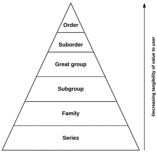 Pedodiversity is influenced by intrinsic (within the soil) factors, including taxonomic, genetic, parametric, and functional pedodiversity, which provide an important context for analyzing, interpreting, and reporting ES/ED within the ES framework. Although each approach can be used separately, three of these approaches (genetic, parametric, and functional) fall within the “umbrella” of taxonomic pedodiversity, which separates soils based on properties important for potential use. Pedodiversity in the U.S. can be quantified and valued within the framework of the USDA Soil Taxonomy (Soil Survey Staff, 1999 []), an international system of soil classification, with the purpose of organizing soils into groups with similar properties. Soil individual (a three-dimensional body) is the object of soil classification in Soil Taxonomy, which is based on a nested and hierarchical system with six taxonomic categories: order, suborder, great group, subgroup, family, and series (e.g., Cecil (Fine, kaolinitic, thermic Typic Kanhapludults) (Table 4). Table 4 demonstrates an example of criteria and sequence of taxonomic categories used to classify mineral soils (this sequence is different for organic soils and soils with permafrost). Soil Taxonomy is the basic system of soil classification for making and interpreting soil surveys, which can be used with the ES framework (Figure 2, Table 5).