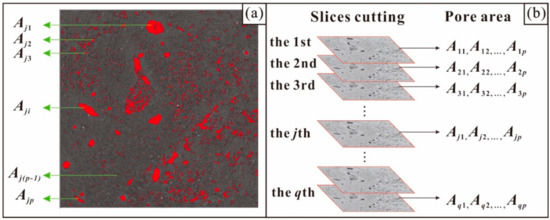 Volume analysis of the pores in the computerized tomography (CT) images: (a) the pores in a certain slice of the 3D model, and (b) the total volume of pores in all slices.