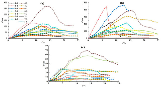 Stress-strain curves of all samples obtained from the unconfined compressive strength tests: (a) undisturbed samples, (b) remolded samples, and (c) saturated samples.
