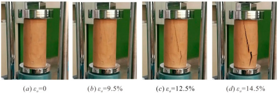 A complete destruction process of the undisturbed sample (taking the sample 1-1 as the example): (a) the initial state of the sample, (b) the phase of the elastic deformation, (c) the failure of the sample, and (d) the residual deformation phase.