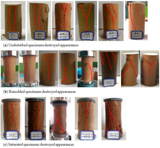 Under the effect of external loading, soil particles will slide and rotate, with microcracks developing and spreading continuously and appearing as cracks and macroscopic sample failure. As seen in Figure 5, according to the shape and direction of the cracks, the failure modes of the samples can be divided into five types: (i) linear splitting, (ii) Y-type splitting, (iii) diagonal shear, (iv) wedge shear, and (v) Y-type shear failure. Category (i), (ii), and (iii) can be seen in the undisturbed samples (Figure 5a). The remolded samples (Figure 5b) exhibited all failure modes except the (ii), whereas the saturated samples exhibited only linear splitting failure and Y-type shear failure (Figure 5c). The statistical results indicated that Y-type shear failure was the main failure mode in the undisturbed and saturated samples, while the remolded samples were dominated by wedge shear failure. The cracks on the failure surfaces of the remolded samples occurred in relatively arrangements and shapes, and the direction of the cracks were similar, with a small number of inflection points. In contrast, the cracks in the undisturbed samples had more extension directions and more inflection points. This is possibly because the preparation process of the remolded samples made their soil structures more homogeneous than that of the undisturbed samples. The undisturbed samples, influenced by the forming mechanism of loess, may have quite large heterogeneity of soil structures, causing the cracks to extend along the weak places first under loading conditions. Compared with the undisturbed samples, all the pores of the saturated samples were filled with water, which enhanced the heterogeneity of the soil structures, so more irregular cracks formed in the saturated samples.