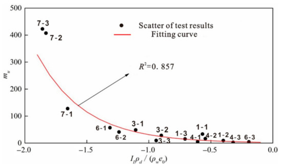 where (qu)o, (qu)r, and (qu)s are the unconfined compressive strengths of undisturbed soil, saturated soil, and remolded soil, respectively. Meanwhile, mu has a close connection with the comprehensive physical index (ILρd)/(ρwe0) [2] (with a correlation coefficient of up to 0.9 in some cases [34], where IL denotes the liquidity index, ρd denotes dry density, ρw is pure water density, and e0 is soil porosity. Hence, the relationship between the LSI and comprehensive physical index can be fitted if these values are obtained.
