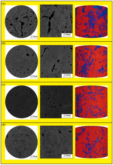Computerized tomography scanning, which was first applied in the medical field, has been widely used in recent years to solve geotechnical problems [48]. As a non-destructive characterization method, this technique is helpful for visualizing and quantitatively measuring the internal structure of samples [42]. In this study, CT scanning of undisturbed soil was performed on XTH225ST machine produced by NIKON company (https://www.nikon.com/, accessed on 20 October 2020), in the Industrial CT Scanning Laboratory of China University of Geosciences (Beijing, China). It should be noted that only four samples (samples 1-1, 6-1, 6-2, and 6-3) were selected for CT scanning owing to the limitation of the workload and the complexity of the subsequent analysis process. Because a smaller sample size can ensure a higher image resolution, the samples were prepared as cylinders with a size of Φ 20 mm × H 20 mm. The 225 kV barrel was selected as the X-ray generator, and the parameters in the scanning process were set as follows: (i) 135 kV tube voltage; (ii) 57 μA tube current; (iii) the scanning time of a single photo was 1 s; (iv) the scanning method was translation-rotation (TR) mode; (v) the image resolution was 14 μm. The CT images were obtained in TIFF format and then preprocessed with Gaussian noise-reduction filters and brightness and contrast adjustments (to improve the quality of the final model). CT Pro 3D was then used to reconstruct the images into a 3D model of each soil sample. Finally, the reconstructed 3D model was cut into many slices, each one pixel thick, using the VG Studio Max software. The output images, in Image Stack format, were then analyzed visually.