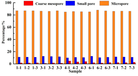 The reconstructed 3D models of the samples were shown in Figure 7. The blue areas indicate pores while red indicates soil particles. It is clear that the pore distribution was rather uneven, which represents that the samples had high heterogeneity. VG Studio Max software was used to analyze the pore properties of the samples, including the number of pores, pore volume, and porosity of the samples. In this process, the minimum probability that the software recognized the pores was set to 5%. The whole sample was selected as the region of interest (ROI). The final results can be seen in Table 2. It should be noted that due to the size uncertainty of the ROI selected by the software, the pore characteristics in the table represent the normalized data. Overall, with an increase in the sampling depth, the 3D porosity of the samples decreased. In addition, the porosity of the L2 layer was less than that of the S1 and L1 layers. The pores were divided into four categories based on diameter (D): (i) micropores (D ≤ 100 μm), (ii) small pores (100 μm ≤ D ≤ 200 μm), (iii) coarse mesopores (200 μm ≤ D ≤ 1000 μm), and (iv) macropores (D ≥ 1000 μm). As seen in Figure 8, the percentage of micropores in the loess of Baode County (sample 1-1, 1-2 and 1-3) was slightly higher than that in other samples. The percentage of coarse mesopores in samples 3-1, 3-2, and 3-3 was much lower than in the other samples. This is considered to be associated with the content of clay particles. The pores formed between these particles were generally smaller than between other types of particles and could be filled by fine substances.