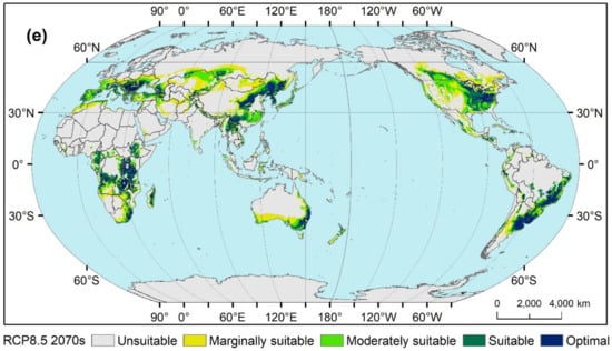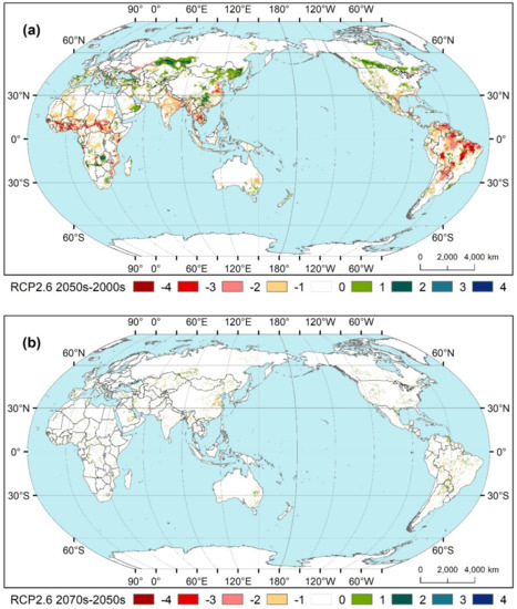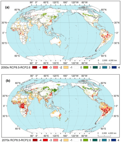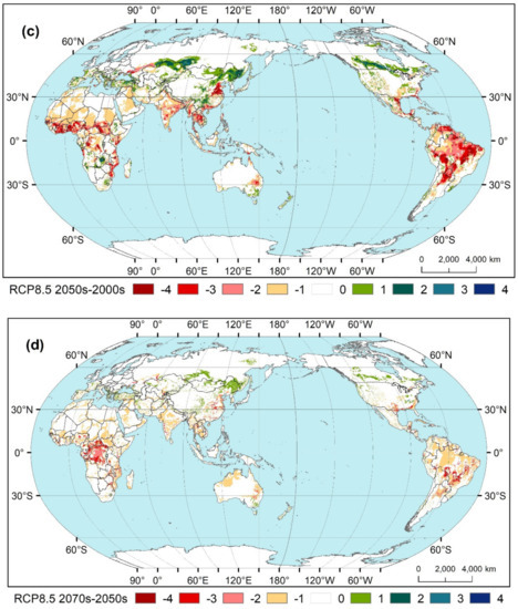 3.3. Worldwide Land Suitability for Maize during Three Periods and under Two RCPs