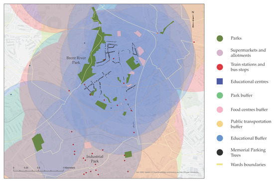 For the MPT spatial analysis, we selected Stonebridge, Northwestern ward, located in the London borough of Brent, three kilometres away from Wembley Stadium. This originally seventeenth-century neighbourhood grew by the river Brent. Even though the environmental risk is considered moderate compared with other areas of the city, the social inequality factor indicates that it is one of the city’s most deprived wards. The North Circular Road, rail tracks, and an important industrial area encapsulate this ward. The ward has the condition to allocate 493 MPTs (Figure 2).