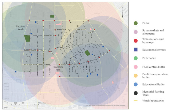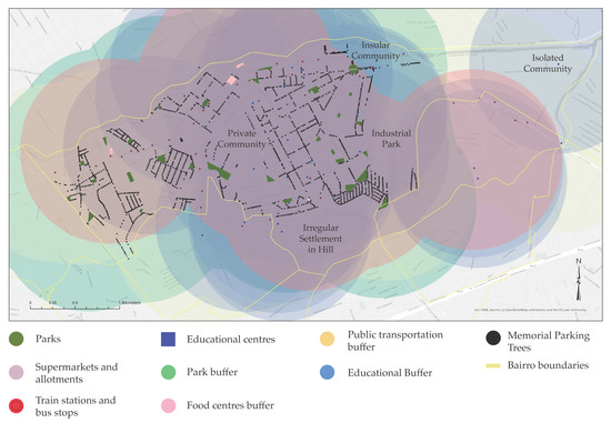 The fifth and last stage describes the areas inscribed within a 15-min city using a one-kilometer buffer spatial analysis from parks, elementary schools, and bus stops. This last analysis shows how this study could complement other urban sustainable initiatives to improve cities’ quality of life.
