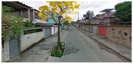 Extreme temperature and air pollution are part of everyday life. In recent years, several flooding events occurred. The neighbourhood has the condition for the distribution of 1904 MPTs (Figure 6). The main restrictions to the designated vacant spaces for the trees were the industrial park, the irregular settlements, and private communities. Besides, the street configuration, with extraordinarily confined streets, limited the available space; cars have to park over the sidewalks to leave enough space for transit. Most of the streets selected have drainage systems and aerial infrastructure on one side, leaving the other side for the MPTs. The MPTs’ design includes a five by 1.5-m bioswale, with a tree and middle stratum, adding more green areas to the city.