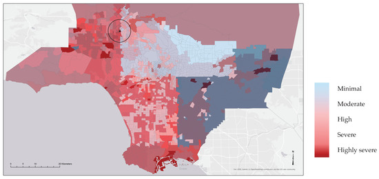 Los Angeles’ vulnerability map. Panorama City neighbourhood appears in the middle of the black circle.