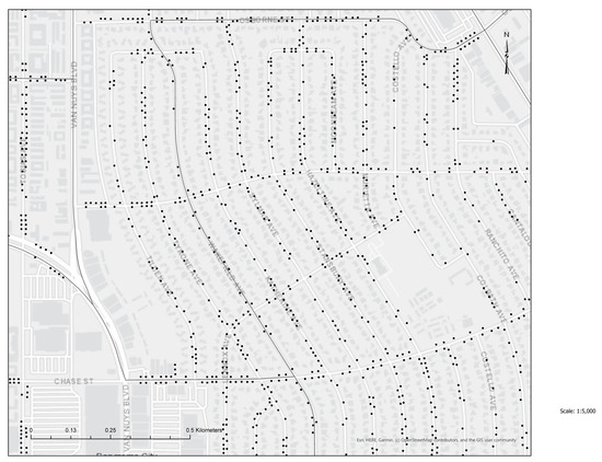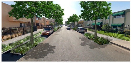 Panorama City is in the San Fernando Valley, on the north-eastern side of the city, and is the first planned suburb in this area. The neighbourhood features a conspicuous zonification of low-height apartment buildings, single housing, and a large shopping centre. The Pacoima Wash is on the east side of the neighbourhood. For the MPT analysis, we encountered a total of 1501 spaces, an incredible amount, considering that it is known as a suburban community. The spatial analysis noticed that MPT spaces allow the use of both sides of the street. In certain areas, bioswales fuse lawn strips that exist between the road and sidewalk, increasing the benefits of this NbS solution (Figure 10).