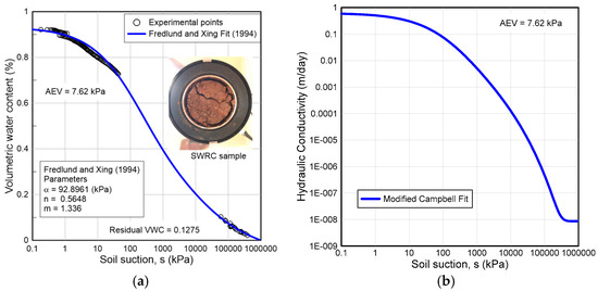 where k = hydraulic conductivity of the water phase (m/day); ks = saturated hydraulic conductivity of the water phase (m/day); kmin = calculated minimum hydraulic conductivity (m/day); p = parameter used to control the modified Campbell [28] estimation of hydraulic conductivity; af, nf, mf and hr are Fredlund and Xing [27] SWRC fitting parameters as explained above. It should be noted that the saturated hydraulic conductivity and a fit of the soil-water characteristic curve by the Fredlund and Xing [27] equation is used as an input to get the predicted kunsat-ψ curve in this research. However, the experimental test results are used to predict the SWRC needed. Figure 4a shows the experimental soil water retention curve (SWRC) data obtained from HYPROP and WP4C equipment which is best fitted with Fredlund and Xing [27] model along with the predicted unsaturated permeability with respect to suction from modified Campbell [28] model as shown in Figure 4b. The best fit parameters, air entry value (AEV) and residual volumetric water content are also presented in each figure.