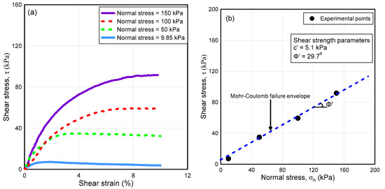 Furthermore, three undisturbed direct shear test (DST) samples were retrieved by driving steel rings with 0.0635 m (~2.5 inch) diameter and 0.0254 m (~1 inch) in height from the same depth and nearby location of each layer from the site. The idea was to obtain samples that were almost identical in soil properties such as initial water content, dry unit weight and voids ratio. Each DST sample was first soaked, that is, fully saturated in the shear box. Each of the 3 samples was then consolidated under 50, 100 and 150 kPa normal stress, respectively. Finally, once the consolidation was completed (which took at least 24 h), each sample was then sheared at a very slow rate of 7.196 × 10−8 m/s (~0.00017 inch/min) ensuring that no excess pore water pressure (PWP) was developed throughout shearing maintaining fully drained conditions. The stress-strain results obtained from DST are shown in Figure 6a. The results at peak failure were plotted in a normal stress vs. shear stress plane to obtain material parameters, that is, effective cohesion (c’) and effective friction angle (ϕ’) interpreted from a Mohr-Coulomb failure envelope (Figure 6b). Thus, these DST tests can be classified as consolidated drained (CD) tests simulating the drained conditions at failure like an actual field situation.