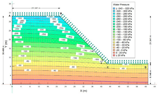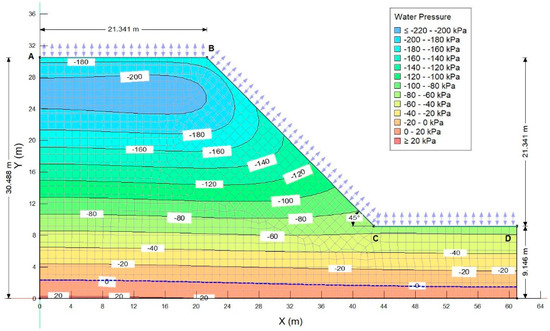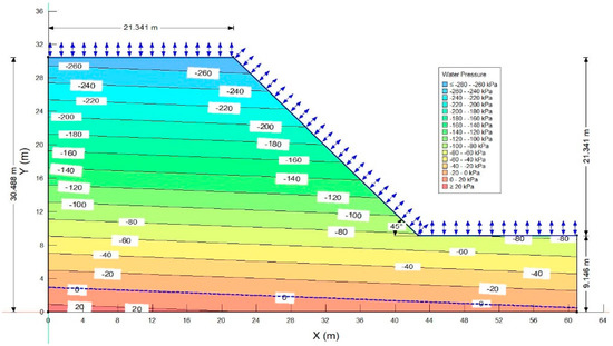 It can be seen through Figure 10 and Figure 11 that initially, on day 1, the PWP within the slope height is highly negative, that is, between −260 to −80 kPa, which essentially represents a dry climate period. The crest portion of the slope shows approximately −260 kPa of PWP. However, as the 26-day antecedent rainfall is applied, the PWP within the slope reduces gradually but at a slow rate resulting in the PWP between −60 to −160 kPa within the slope height. However, upon the application of a major storm at the beginning of the 27th day, the value of this PWP’s changes to between −40 close to the crest and slope to around −160 kPa at a shallow depth of about 2 m from the top horizontal and sloping climate boundary.