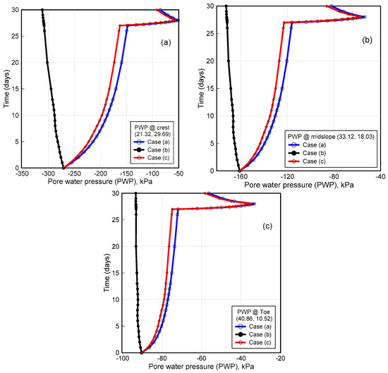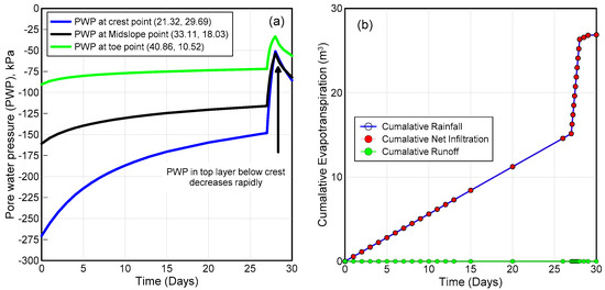 Figure 12a clearly shows that there is a drop in PWP, which may be the triggering cause of slope failure, which will be explained in the subsequent section. Nonetheless, this example simulates the mechanism of reduction in matric suction (negative PWP) resulting from rainfall-induced infiltration. The PWP, with respect to time at crest, mid slope and toe, as marked in Figure 12, are shown. This also indicates that it is more likely to have a slope failure where the top layer might slide over the bottom layer due to a sudden loss of matric suction in a short duration.
