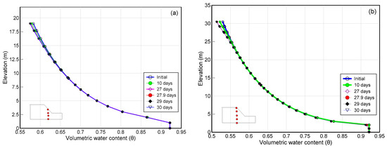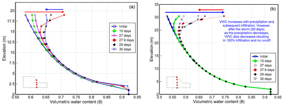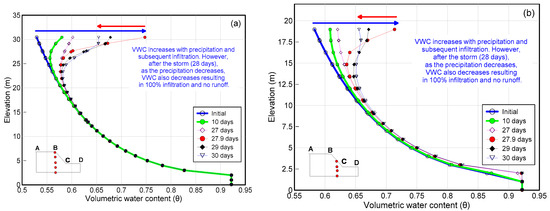 (a) Variation of volumetric water content (VWC) with elevation at (a) mid slope; and (b) crest during different time steps.