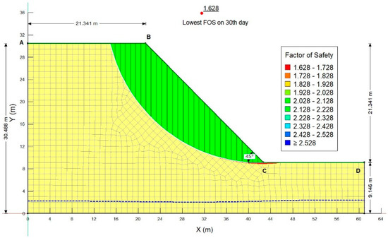 wher, s = overall shear strength of soil; θw = volumetric water content; θs = saturated volumetric water content; θr = residual volumetric water content. If variation of volumetric water content, θw of soil with respect to suction, that is, SWRC, is available, then one can predict the unsaturated shear strength using the Vanapalli et al. [7] equation. However, this shear strength equation reduces to saturated shear strength as the matric suction and hence the last term in above equation drops to zero. Above equation has been implemented in SLOPE/W and was used in this study. The factor of safety was then determined using SLOPE/W software of GeoStudio by importing PWP profiles at each time step. The initial FOS using the Morgenstern and Price method is 1.743. Further analysis of results shows that FOS drops down after the application of 26-day antecedent rainfall at a very gradual rate to a minimum of 1.673 at the end of the 26th day. With the application of a major storm on the 27th day, the FOS decreases rather quickly to 1.628 by the end of the 30th day (Figure 14 and Figure 15).