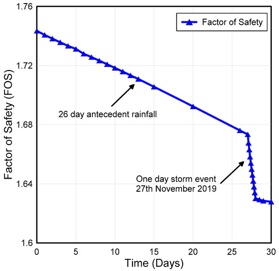 Effect of antecedent rainfall followed by storm kammuri on factor of safety (FOS) with respect to time from Morgenstern and Price method.
