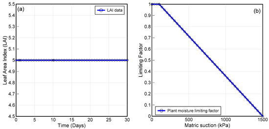 Monthly vegetation data (a) Leaf area index and (b) plant moisture limiting factor as a function of matric suction.