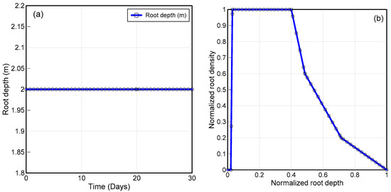 Monthly vegetation data (a) root depth over time and (b) normalized root density versus normalized root depth.