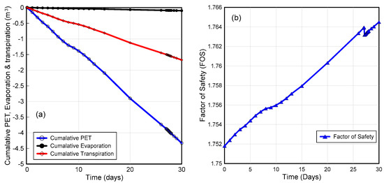 (a) Variation of evapotranspiration, evaporation, and cumulative transpiration over a one-month period; (b) Effect of vegetation and climate without rainfall on FOS with respect to time from the Morgenstern and Price method.