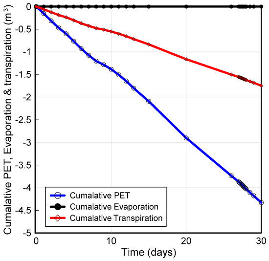 However, the presence of vegetation causes root water uptake (RWU) from the top layer of the soil within the root zone, which causes loss of moisture and an increase in matric suction. This can be readily seen from figures showing the PWP contours at the initial (0 day), and 30th days, that is, Figure 10 and Figure 19, respectively. Figure 20 illustrates the magnitude of cumulative potential evapo-transpiration (PET), transpiration (via RWU) and evaporation from the surface boundary of the slope in response to the vegetation–climate interaction with land in the absence of rainfall.