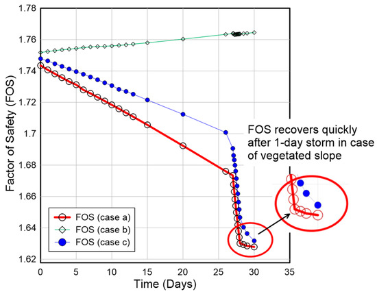 Transient pore water pressure profiles corresponding each day over a month period in response to the earlier presented climate data were imported and a coupled slope stability analysis was implemented using Geostudio software [31]. The transient-coupled-slope stability analysis indicate that FOS decreases with time as shown in Figure 28. The variation of FOS with time is linear during the antecedent rainfall up to 26 days. However, during a major storm event on the 27th day, FOS decreases rapidly and becomes highly nonlinear. For the sake of comparison, results from all 3 cases are shown on the same plot in Figure 28. The interval of analysis was reduced to 0.2 days for 27th day analysis to get an insight on how drastic a reduction in FOS (and hence increase in matric suction) occurs during storm day (27th day). The improvement in FOS due to vegetation is appreciable in case (a) as compared to case (c) up to 26 days of antecedent rainfall, which becomes minimal during the storm event (27th day), indicating that the vegetation effect is more influential in improving stability during long durations and small intensity rainfall (i.e., antecedent rainfall). Needless to say, the marginal improvement of FOS in case (c) as compared to case (a) could play a key role in preventing slope failure when the FOS of a bare slope (case(a)) becomes close to 1. Clearly, the FOS recovers rather quickly after a storm event in the case of a vegetated slope as against the non-vegetated slope. This is attributed to the increase in matric suction due to root water uptake by the plants in the case of vegetated slopes, which causes a reduction in water content in the topsoil layer thereby increasing the FOS. This demonstration again highlights the importance of the presence of vegetation over a slope.
