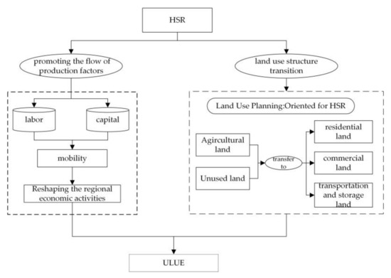 ULUE could be defined as the economic density of urban space, which is calculated by economic output on the urban built-up area [16,35]. Undoubtedly, the optimal allocation of production factors such as labor, capital, and land elements could directly affect urban economic output and ULUE [2,3]. In this paper, the impact mechanism of high-speed rail on urban land use efficiency is summarized as the following two aspects: