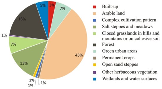 1 Built-up, 2 Green urban areas, 3 Permanent crops, 4 Complex cultivation pattern, 5 Open sand steppes, 6 Salt steppes and meadows, 7 Open rocky grasslands, 8 Closed grasslands in hills and mountains or on cohesive soil, 9 Other herbaceous vegetation, 10 Forest, 11 Wetlands and water surfaces.
