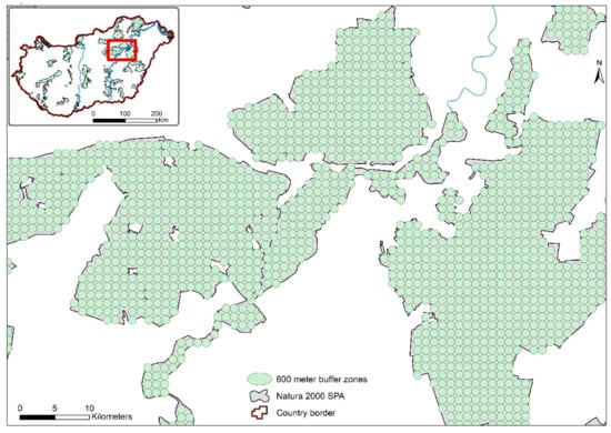 Example the spatial distribution of the 600-m buffer zones inside a Natura 200 Spa protected area of Hungary.