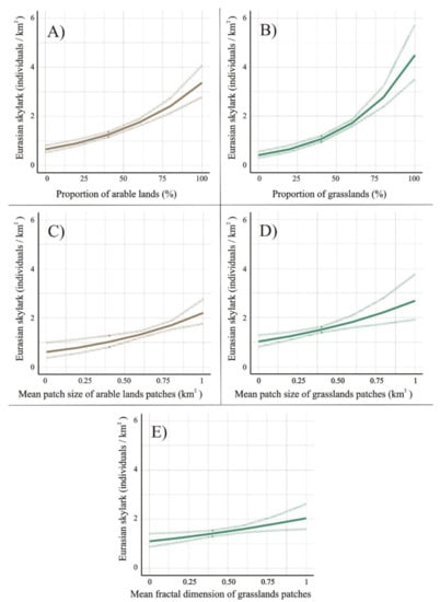 LULC landscape heterogeneity has a negative effect on the skylark in this scale, where one land cover patch can contain more parcels. If landscape heterogeneity increases, the skylark population declines. This species prefer the homogenous LULC structures, which is in accordance with the results of other authors [10,11,16,17,62].