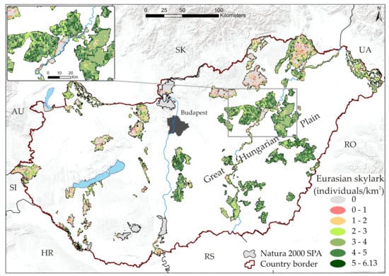 The spatial distribution of the predicted skylark population in each 600-m zone of the Natura 2000 SPAs of Hungary was very diverse (Figure 5). The total investigated Natura 2000 SPA was 13,514 km** which cover the most valuable agroecosystems and rural landscapes of Hungary. Based on model prediction (predict function in R) inside these protected areas, approximately 23,746 skylark individuals were predicted. The density of this species is the highest in the agricultural-landscape-dominated areas of the great Hungarian plain.