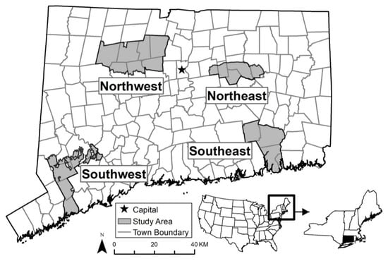 Connecticut is a small state (14,357 km2) located within the northeastern US, and has experienced rapid population growth and exurbanization since the 1950s []. A combination of Connecticut’s high proportion of forest cover (72.6% of the state, []) and high population density (285 people/km2, []) results in the state having the greatest proportion of wildland-urban interface in the US (65.6%, []). Four geographically distinct study areas in Connecticut (Figure 1) were selected based on discussions with project partners and interviews with utility employees (n = 7; author unpublished data); additional criteria included current utility provider, distribution across an urban-rural gradient, ongoing issues with vegetation-influenced power outages, and current or recent utility vegetation management activity along roadsides in that location [].
