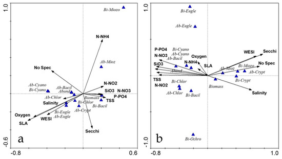 | Abundance, 103 cells L−1 | Biomass, mg m−3 | Index Saprobity SLA | Index WESI | Abundance, 103 cells L−1 | Biomass, mg m−3 | Index Saprobity SLA | Index WESI | |