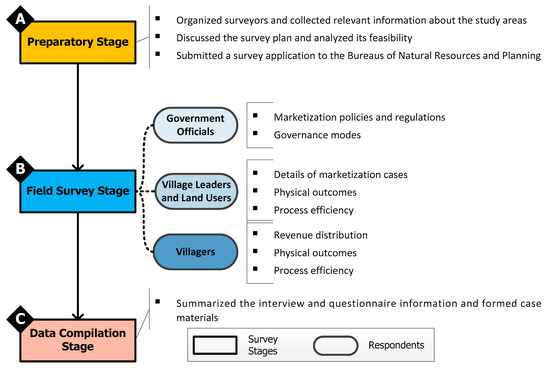 The surveys were funded and led by the Chinese Institute of Land Survey and Planning, which is a public unit under the Ministry of Land and Resources. The survey scheme consisted of three specific procedures. First, in the preparatory stage, we organized surveyors and collected relevant information on the study areas. Before we conducted the study, with the guidance of a tutor, our research group held several meetings to discuss the detailed survey scheme and analyze its feasibility. We consulted the officials in the Bureau of Natural Resources and Planning in Meitan County and Pi County and obtained their permission to conduct the survey. Second, in the field survey stage, we visited the Bureau of Natural Resources and Planning to interview the government officials who were in charge of the CCCL marketization reform, villagers, and land users (enterprises and individuals) of the two case areas. The government officials introduced us to some marketization policies and regulations, recommended some successful CCCL marketization reform cases, and illustrated the commonly adopted governance modes and their characteristics for CCCL marketization in the two aforementioned case study areas. As village leaders are more familiar with the specific cases, they informed us of the details of the marketization cases such that we could collect information about the physical outcome and all categories of transaction costs produced during CCCL marketization. We visited land users to obtain information about the physical outcome and information searching costs for CCCL marketization. For the villagers, we concentrated on the performance of CCCL marketization from the perspectives of the physical outcome, process efficiency, and revenue distribution. Third, in the data compilation stage, we summarized the interview and questionnaire and formed case materials. Figure 3 illustrates the survey scheme.
