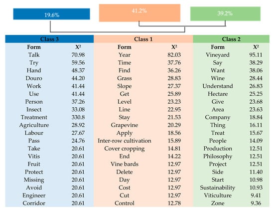 The first analysis, the Descending Hierarchical Classification (Figure 1), shows how categories are formed according to the value of the chi-squared of the words used by interviewees in their discourses; that is, it highlights which words are more expressive in their narratives. The categories were designated as “global winemakers”, “observing and reproducing the techniques”, and “labour constraints”. This classification as well as the designation of each category has been strengthened by another interface resource: the identification of text segments associated with each category, which makes it possible to do a qualitative analysis of the corpus [63] based on the most statistically relevant words.