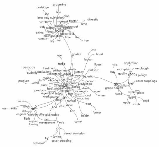 Thus, “be1” is central and relates to dynamic verbs like “go” and “do”, to a verb for possession, “have”, and to a verb expressing a temporary situation, “be2”. “Have” is connected with words reflecting the conditions (resources) for EIs to be implemented (time, hectare, area, people, and tractor) as well as to those indicating more sustainable practices (animal, diversity, partridge, tree, and life). The term “be1” also relates to words expressing conditions and indicators, but it is also connected to words referring to human aspects (farmer, man, consumer, person, and labour), and to space (region, environment, Douro, zone, and background). On the other hand, “do”, “go”, and “be2” have to do with agricultural practices associated with EIs (sowing, cover cropping, I plough, seed, and apply) and the wine product (grape harvest, wine, product, production, produce, and grapes).