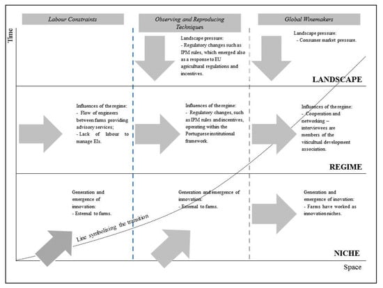In addition, it is our opinion, the landscape dynamics and influences should be further developed in future studies [31]. In Douro, we are faced with a situation in which a group of farmers not only feel the pressure of the landscape, but also determine how to operate it. Because their farms are niches where EIs can be developed, these farmers contribute to implementing and spreading innovation, keeping up with the dynamics of viticulture at a global level while disrupting it locally. In the end, this influences those who, despite being part of the regime, are not under the direct influence of the landscape. In other words, our research has shown that there may be some transition cases where there is a close cause-and-effect relationship between the dynamics of niche and landscape. Therefore, the latter cannot be underestimated by transition studies.