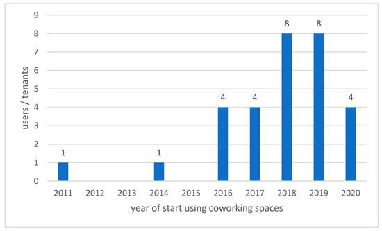 Coworking spaces in a rural context are more or less a new form of telecommuting []. Most tenants use their main coworking space for 1 or 2 year (see Figure 1). The invention of coworking as a concept started from 1995. The term coworking was introduced in 1999 and the first so designated coworking space opened in 2005 in San Francisco []. The number of coworking spaces are increasing rapidly since 2005, mainly in agglomerations. In rural regions, towns or villages are existing some coworking spaces for some time []. Since the last 2–3 years the number of coworking spaces outside of major cities is growing rapidly.